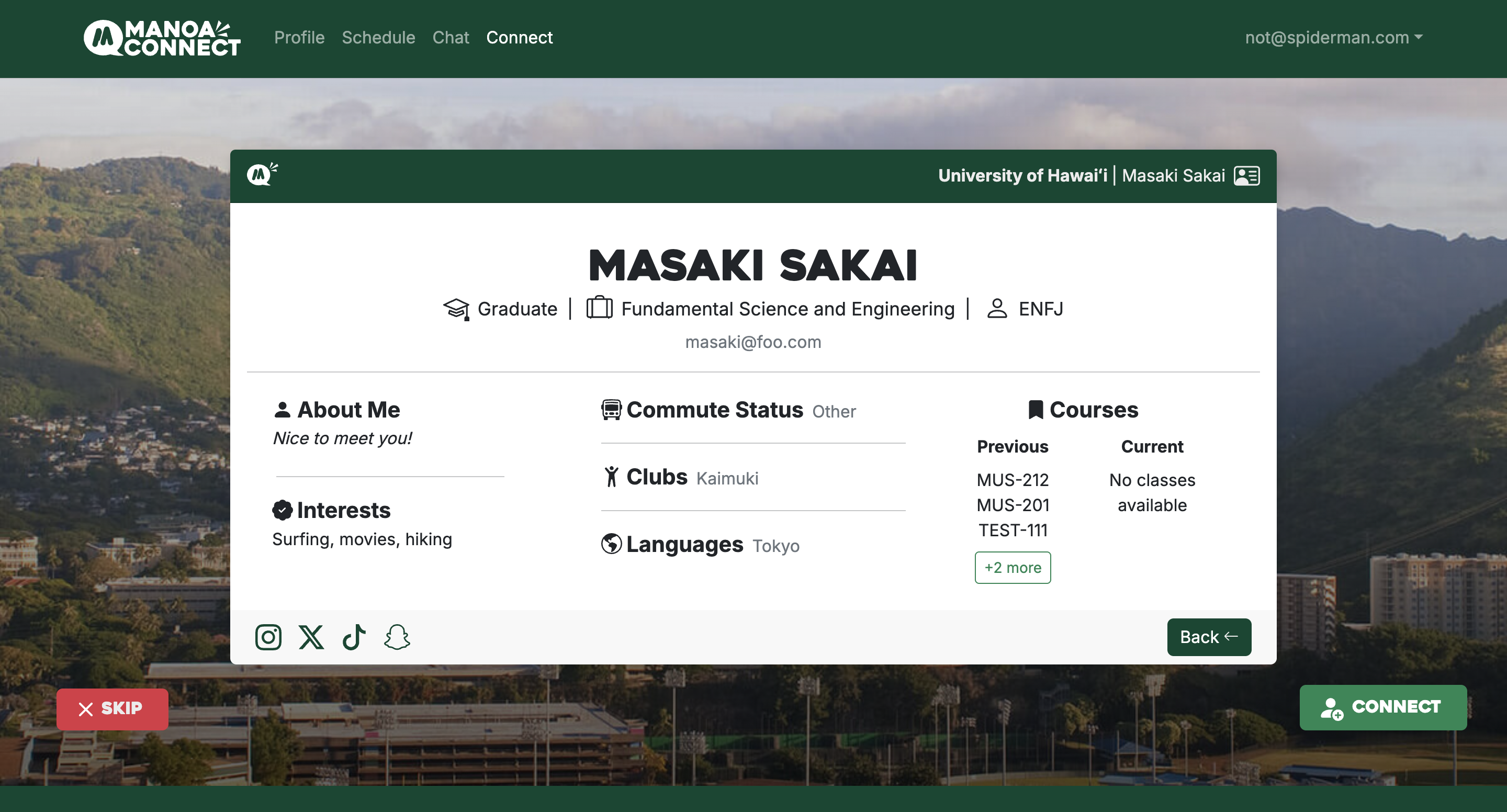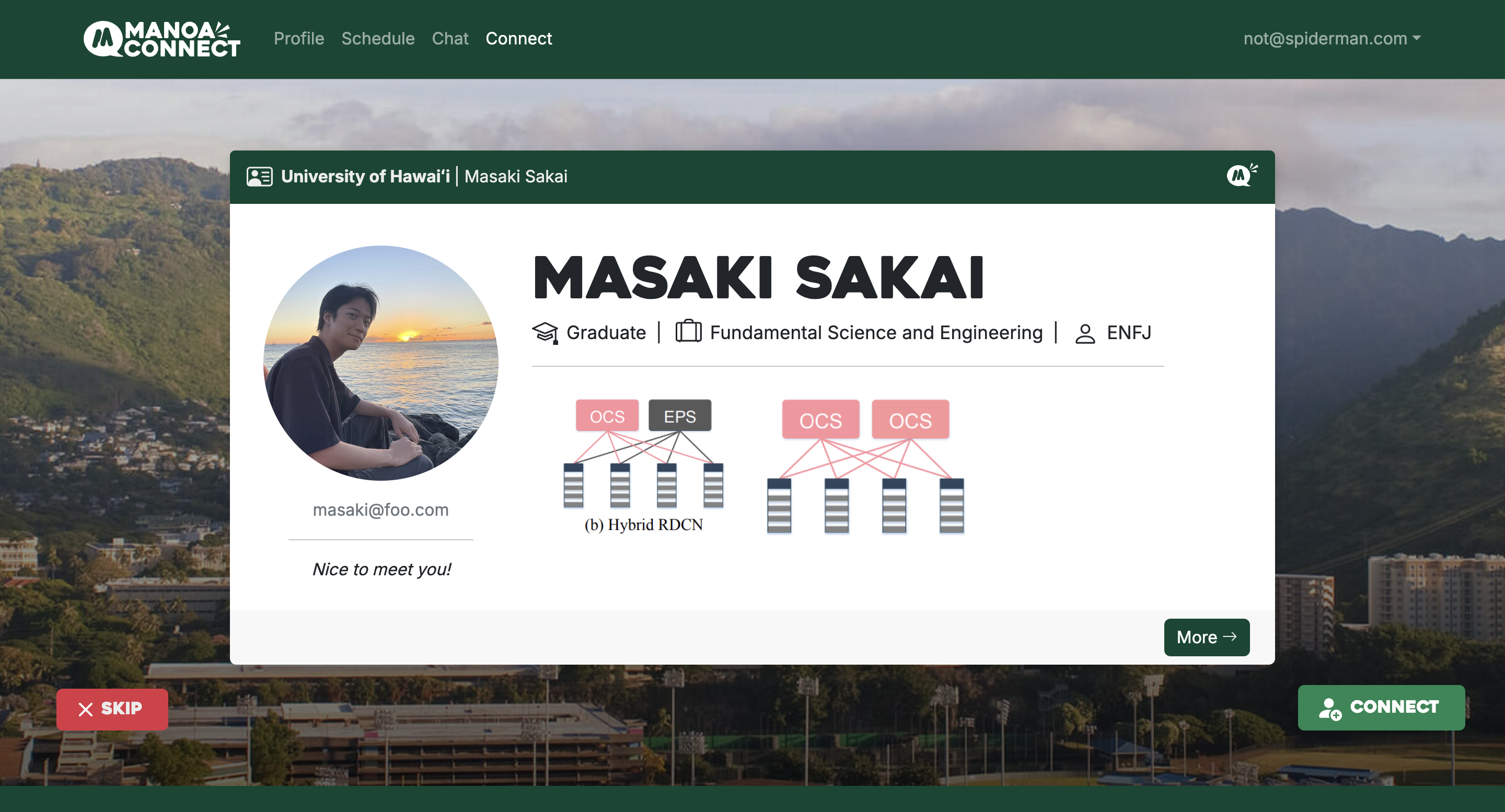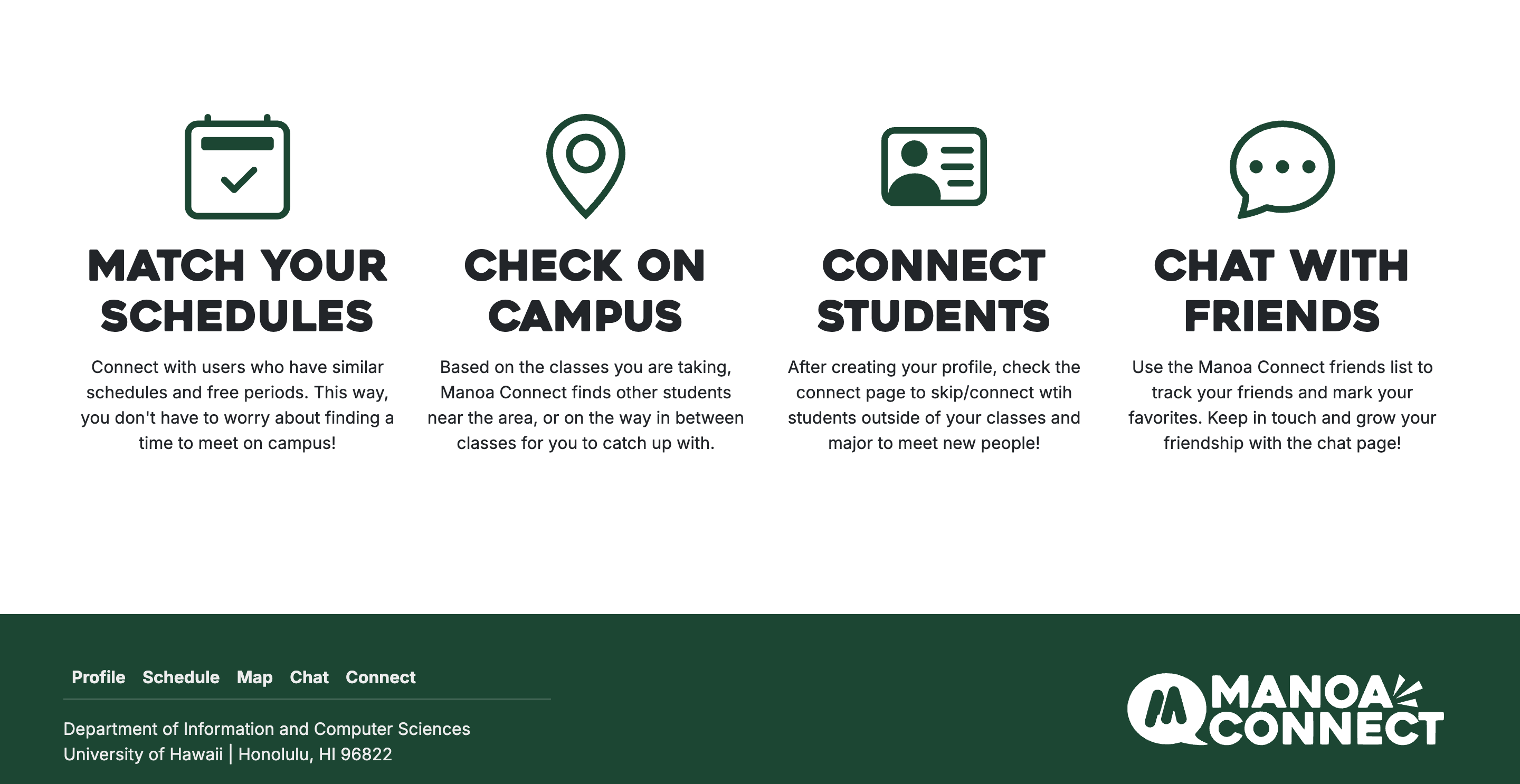 We found the problem that many of the people you meet as college students are usually within the same majors and fields as you meet most of them in your classes or clubs related to your major. So this is where our website Manoa Connect comes in to allow UH Manoa students to meet people outside of their major and chat with them, making friends along the way. To accomplish this, we used Postgres SQL for our database and a mix of TypeScript, ReactJS, React Bootstrap, and NextJS to make each page. Our site has 4 main features: