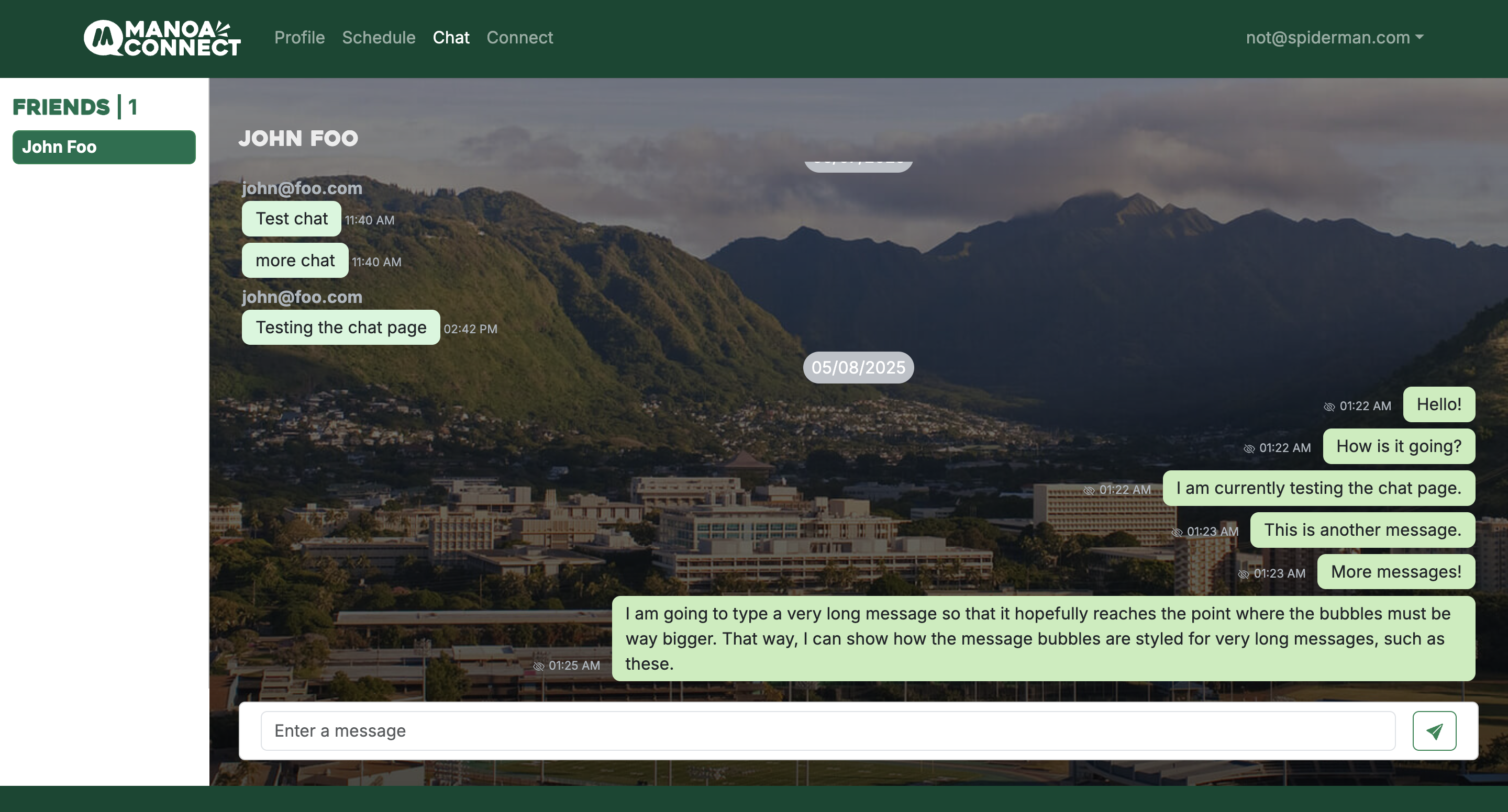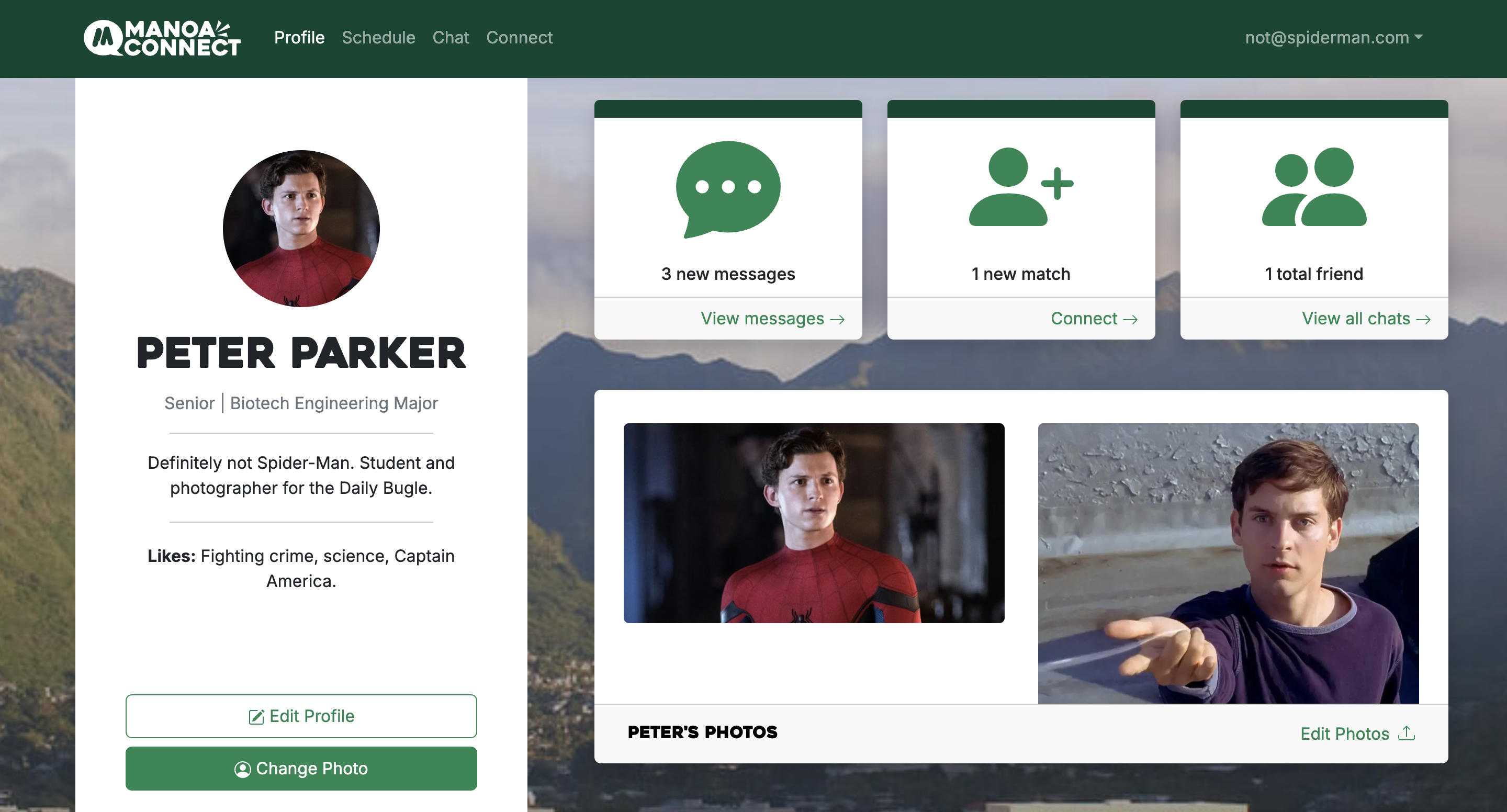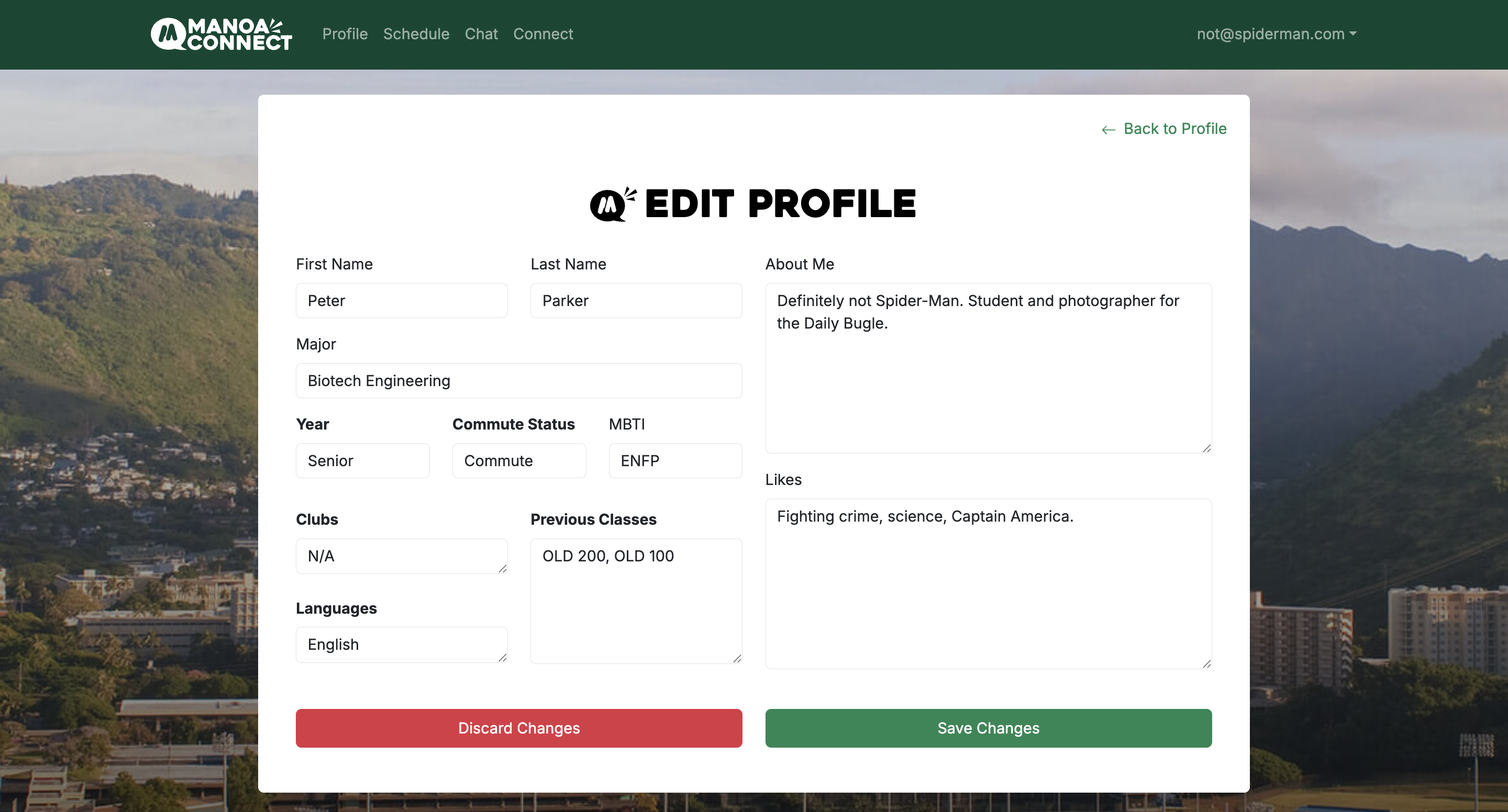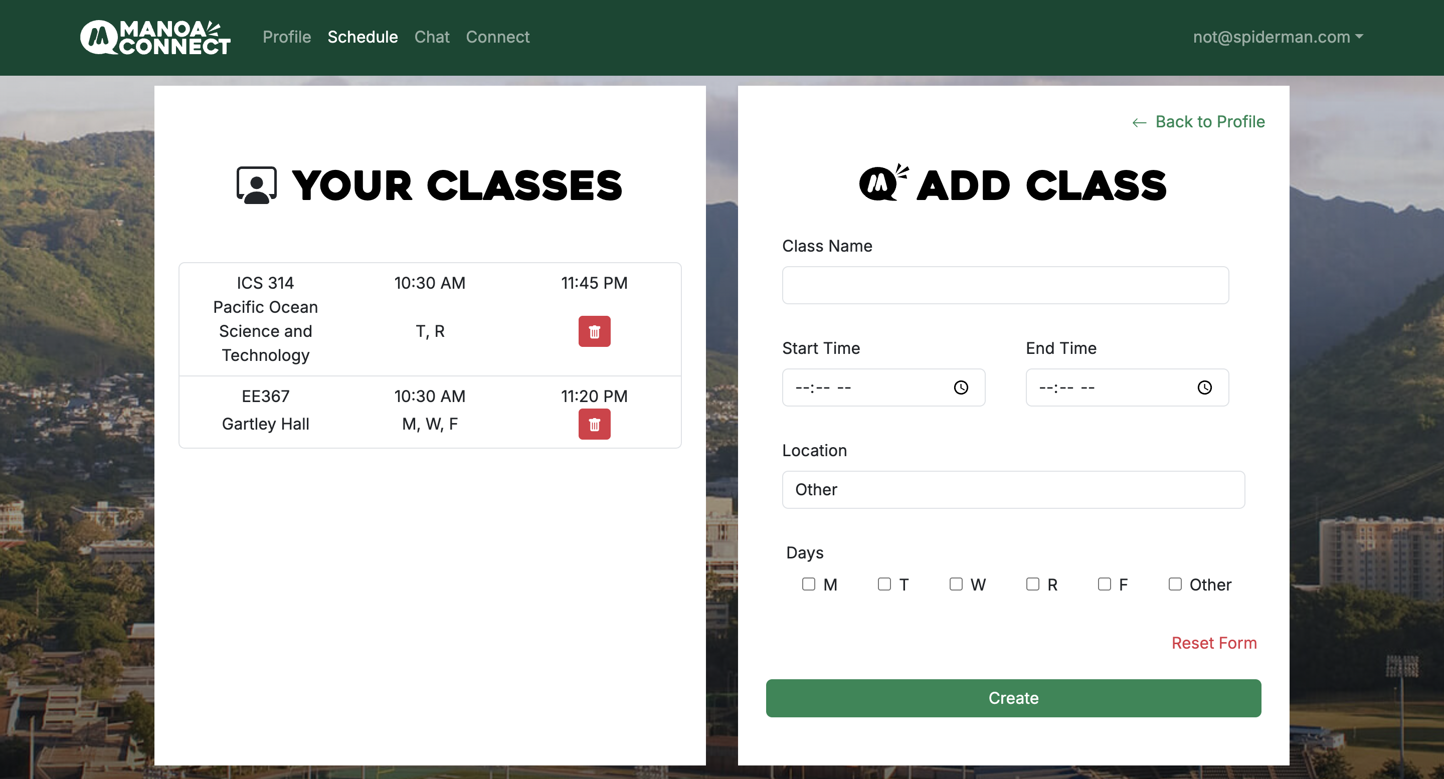 We found the problem that many of the people you meet as college students are usually within the same majors and fields as you meet most of them in your classes or clubs related to your major. So this is where our website Manoa Connect comes in to allow UH Manoa students to meet people outside of their major and chat with them, making friends along the way. To accomplish this, we used Postgres SQL for our database and a mix of TypeScript, ReactJS, React Bootstrap, and NextJS to make each page. Our site has 4 main features: